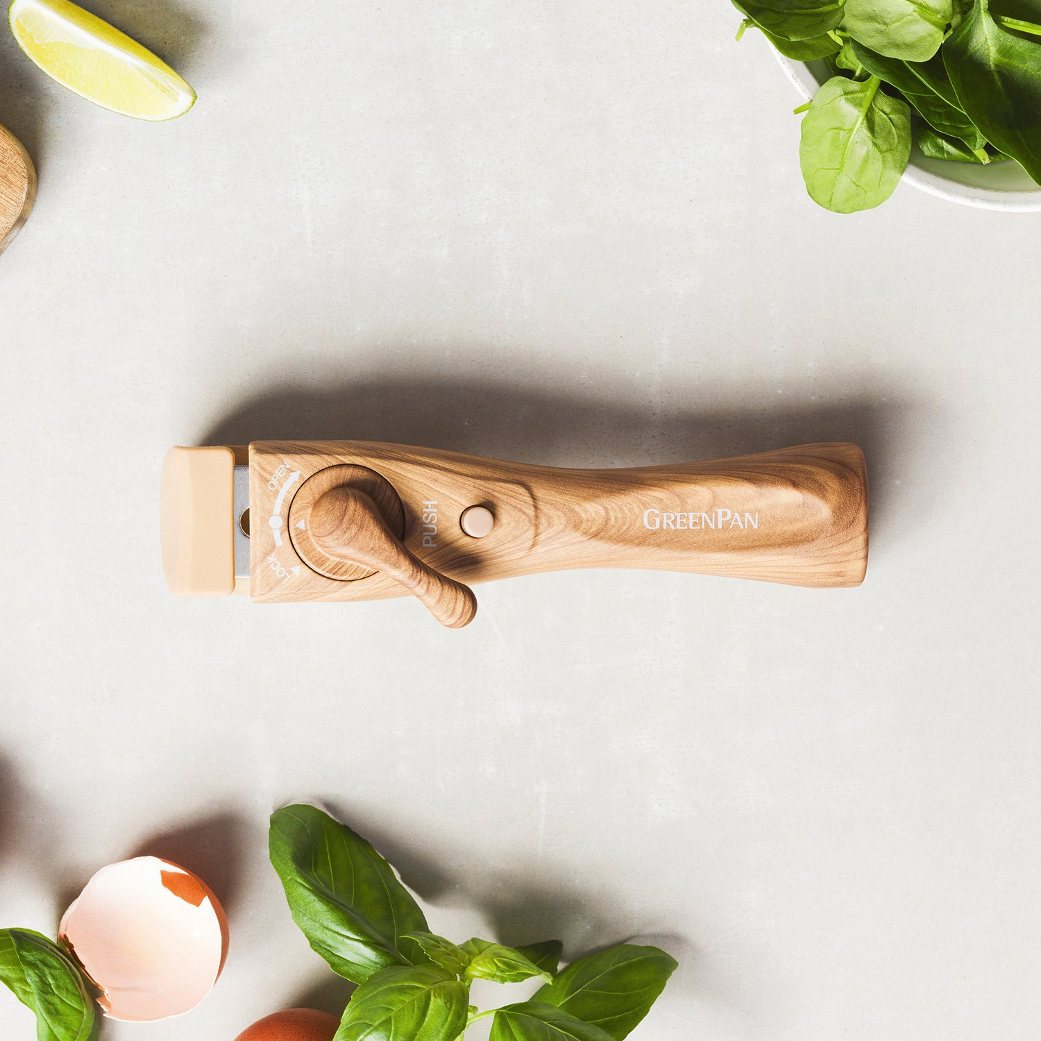 スモーキースカイブルーに映える木目調プリントのハンドルがセットに。