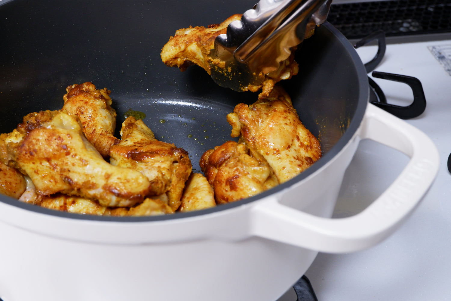 キャセロールなので煮込み料理しかできないと思われがちですが、フェザーウェイトココットはフライパンシリーズと同じセラミックコーティングが施されているので焼き、炒め調理もできます。